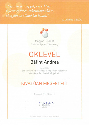 Cerberos Kutyaiskola rehabilitációs kutyakiképző (elméleti és gyakorlati téren egyaránt kimagasló tudást kaptam, fizioterapeutaként is segít a kutyák bizalmának elnyerésében)